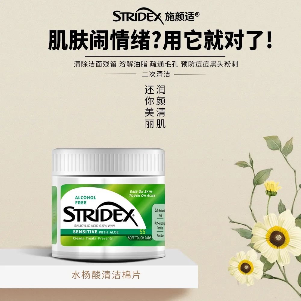 所以优先选择stridex施颜适水杨酸清洁棉片,这款清洁棉片含有0.5%浓度的水杨酸,主打二次清洁肌肤,有很好的的预防痘痘的效果。刷酸小白选它!