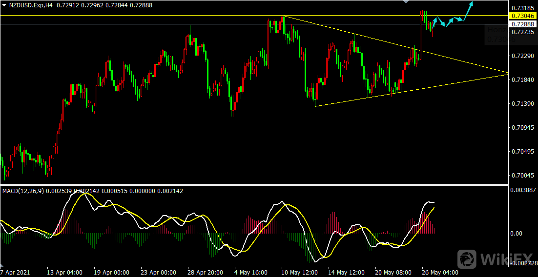 从纽元兑美元4小时走势来看,纽元兑美元收敛已破,接下来前高压力附近的调整情况,若后市一直围绕高点震荡不下,则突破概率很大,若是向下调整,未来则会大震荡。