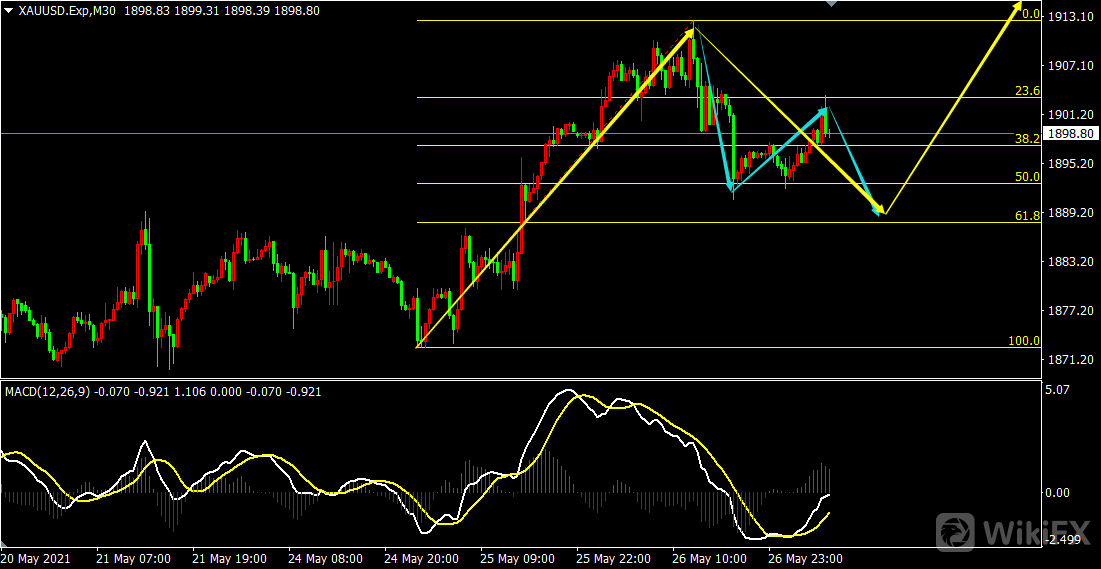 从国际黄金30分钟图来看,黄金早盘未能顺势下跌,先反弹已经表明行情不能一步跌到位,后市还会继续完成调整,而形态则看常规的ABC调整,短线大致还有下跌,本次低点将是这轮调整的低点。