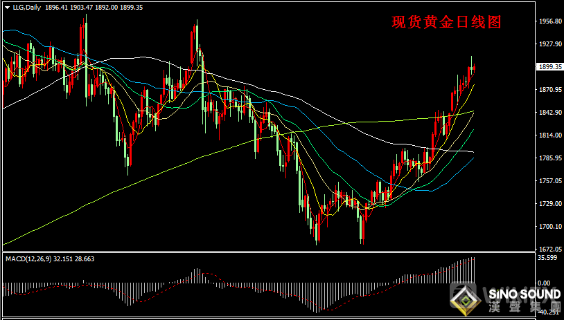 今日周四(5月27日)现货黄金亚市开盘1896.41美元/盎司,早盘金价最低在1892.00美元/盎司,中午时段金价重返1900关口上方,金价最高至1903.47美元/盎司,截稿前金价在1900关口附近整理。