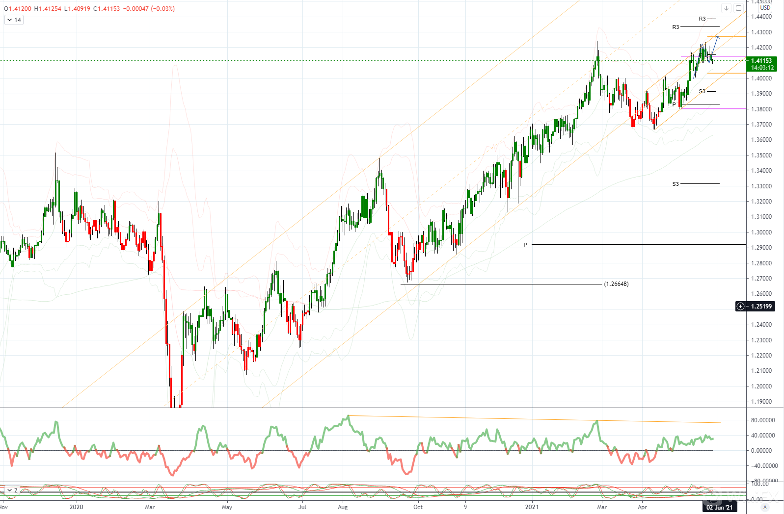 GBPUSD 日内偏差 : 看涨高于1.41看跌低于
