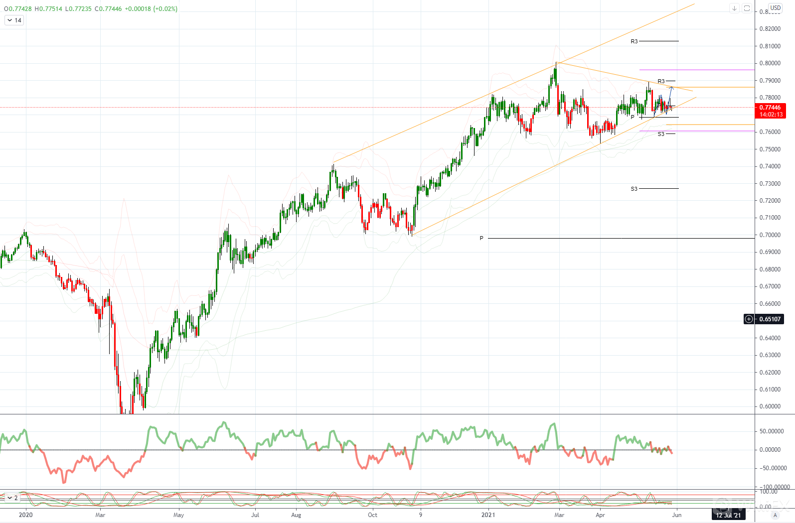 AUDUSD 日内偏差 : 看跌下方.7790看涨上方
