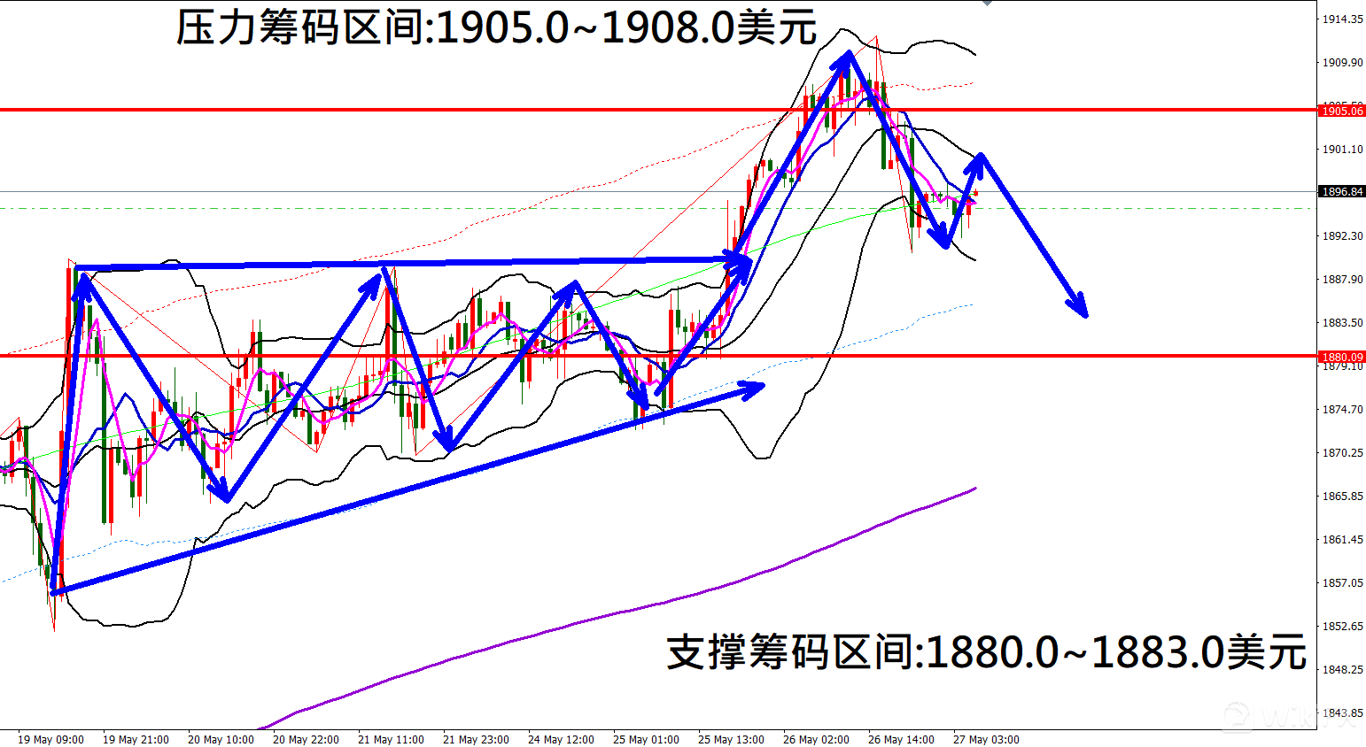 今日黄金(5月27日)早盘在1896.5美元/盎司附近,从技术分析面切入1小时级别观察走势架构符合昨日(26日)预测K棒再度冲高上涨,随后出现大跌行情,目前K棒落在布林通道中轨与下轨之间,同时开口转折朝下,因此有机会持续向下修正。