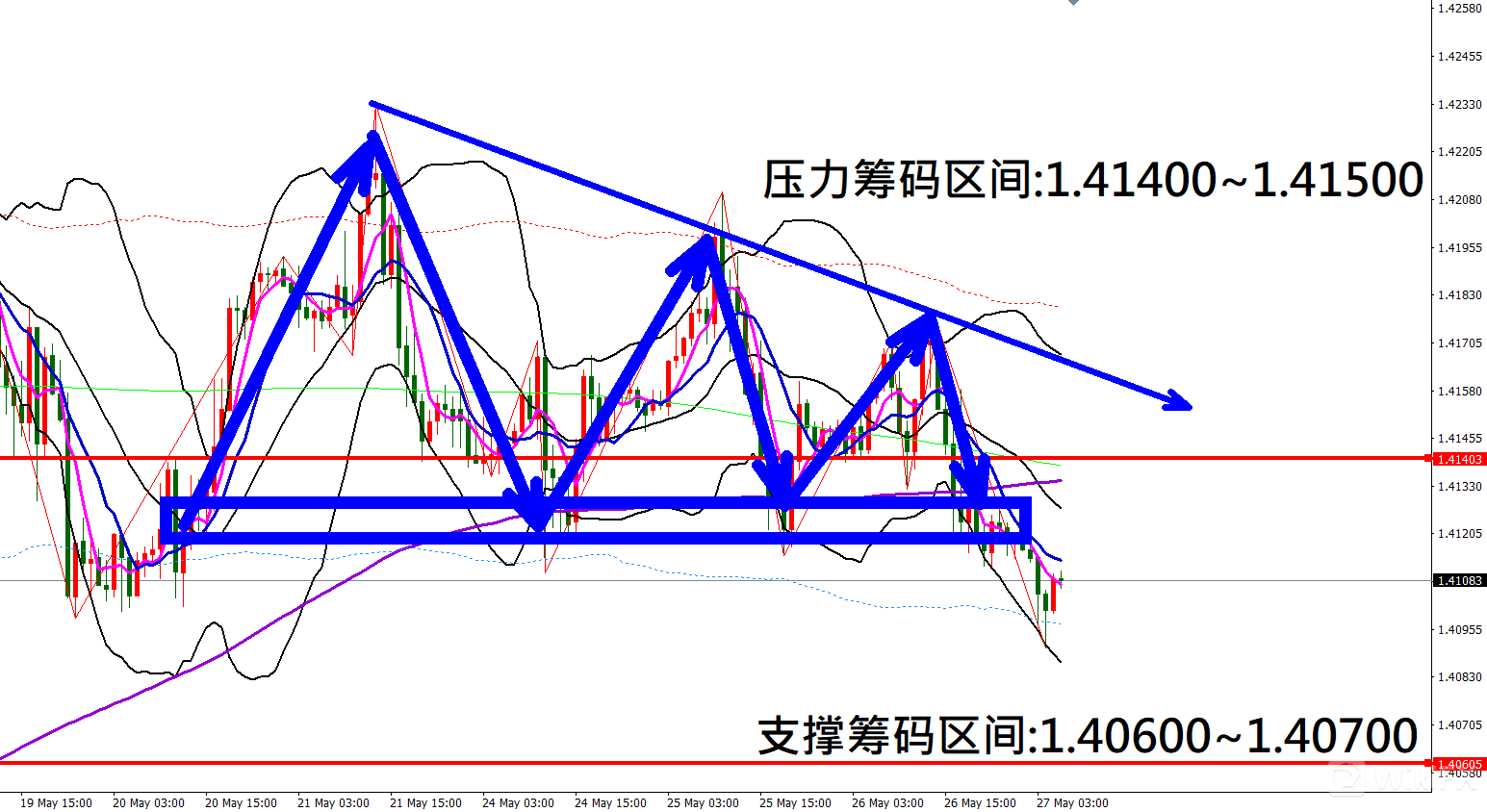 今日英镑/美元(5月27日)早盘在1.41189附近,从技术分析面切入,1小时线级别观察走势架构符合昨日(26日)预测K棒再度向下修正,目前K棒落在布林通道中轨与下轨之间,同时开口转折朝下,因此有机会反弹遇压后再度向下修正。