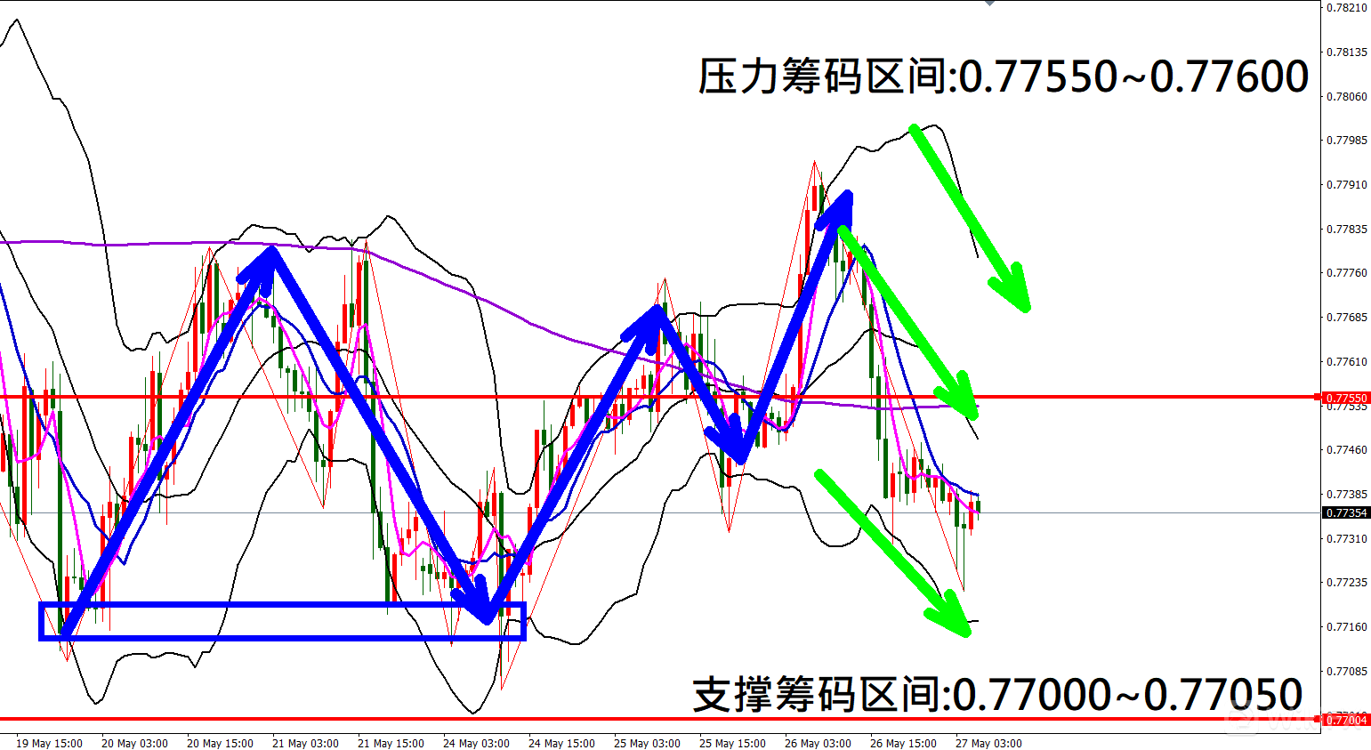 今日澳元/美元(5月27日)早盘在0.77415附近,从技术分析面切入,1小时线级别观察走势架构昨日(26日)K棒盘中大幅大涨后出现大跌行情,目前K棒落在布林通道中轨与下轨之间,同时开口转折朝下,因此有机会反弹遇压后再度向下修正。