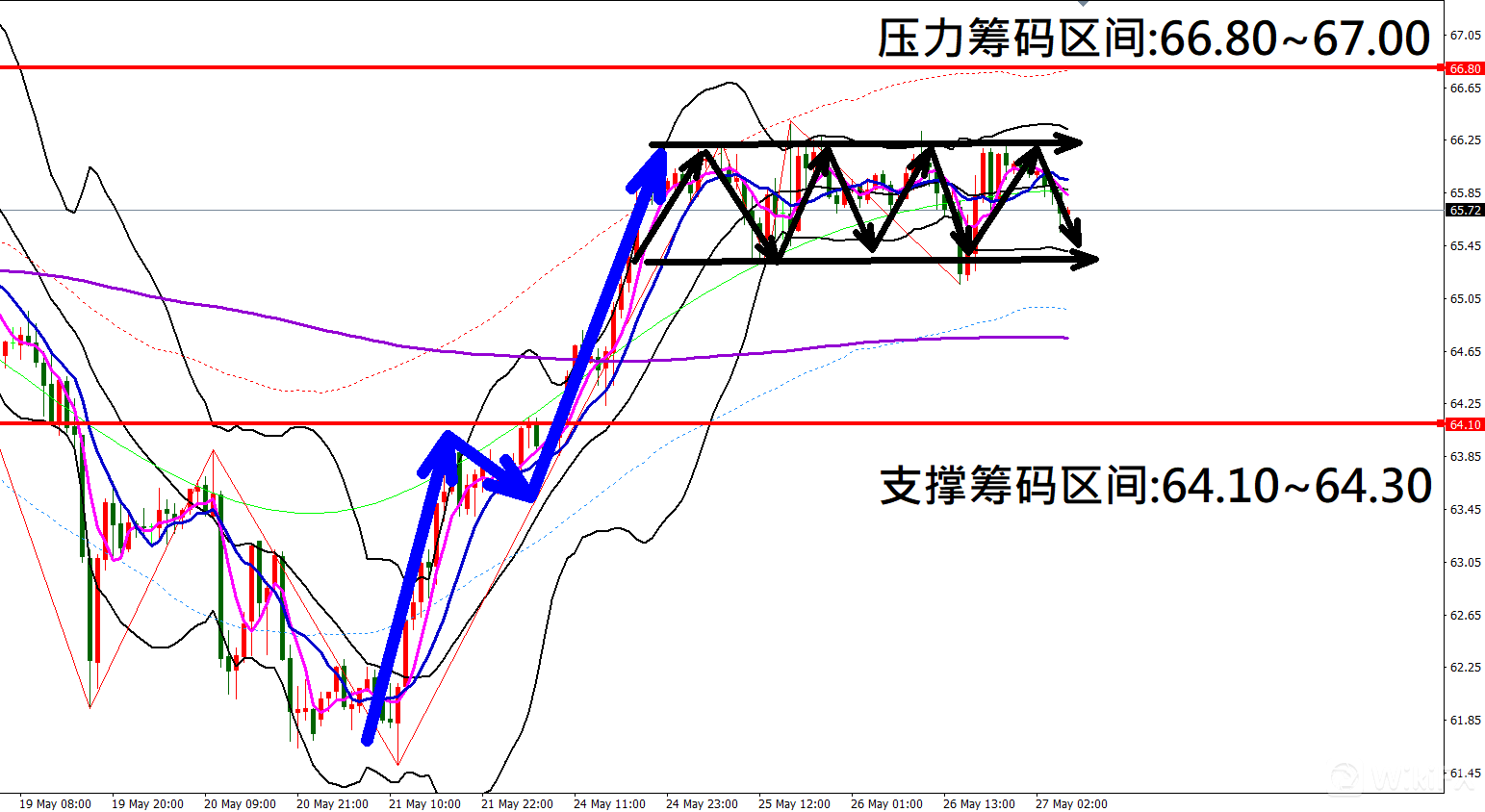 今日美国原油(5月27日)早盘在66.06附近,从技术分析面切入,1小时线级别观察走势架构符合昨日(26日)预测K棒盘中出现拉回修正行情,目前K棒落在布林通道中轨附近震荡,同时开口仍保持缩口,因此有机会持续拉回修正。