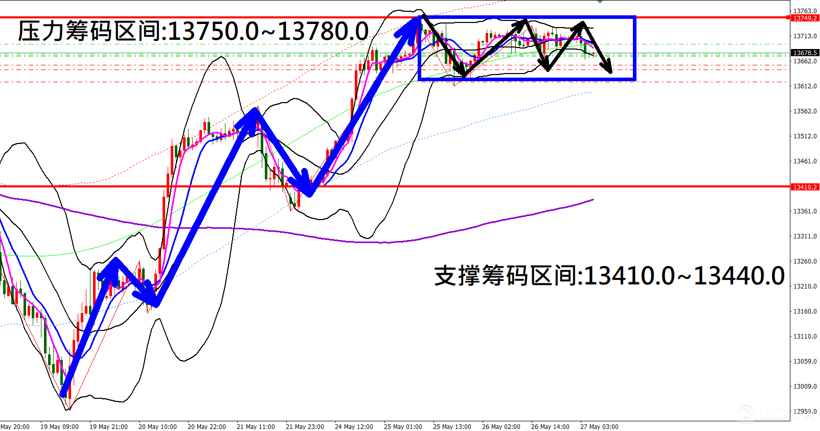 今日纳指(5月27日)早盘在13704.1附近,从技术分析面切入,1小时线级别观察走势架构昨日(26日)预测K棒高点震荡后拉回修正,目前K棒落在布林通道中轨与下轨之间,同时开口转折朝下,因此有机会再度向下修正。