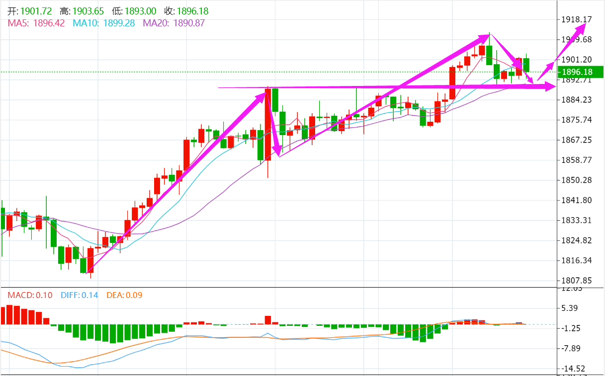 金价冲高回落后盘整于1890-1900区间,后期走势并不十分明朗,目前高点出现下移趋势,短线回调风险尚未解除,下方1880-1890区间支撑强劲,整体维持攀升趋势,建议等待反弹遇阻后逢低做多。 稳重者:入场位1883-1889,止损1876,止盈1904。 激进者:入场位1885-1892,止损1878,止盈1915。