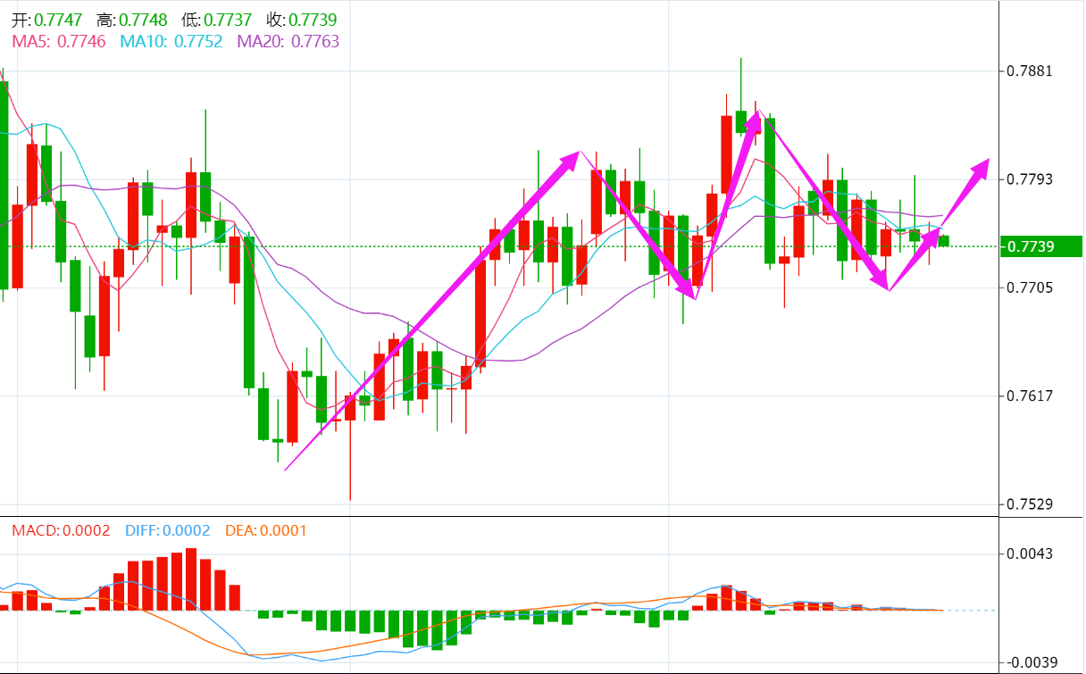 澳美汇率触及0.7700关口后企稳回升,多重底形态依然明确,目前受阻回落至0.7730附近,下方0.7700关口支撑强劲,整体维持震荡筑底格局,建议回调止跌后逢低做多。 稳重者:入场位:0.7650-0.7690,止损位0.7610,目标位0.7750。 激进者:入场位:0.7670-0.7720,止损位0.7630,目标位0.7780。