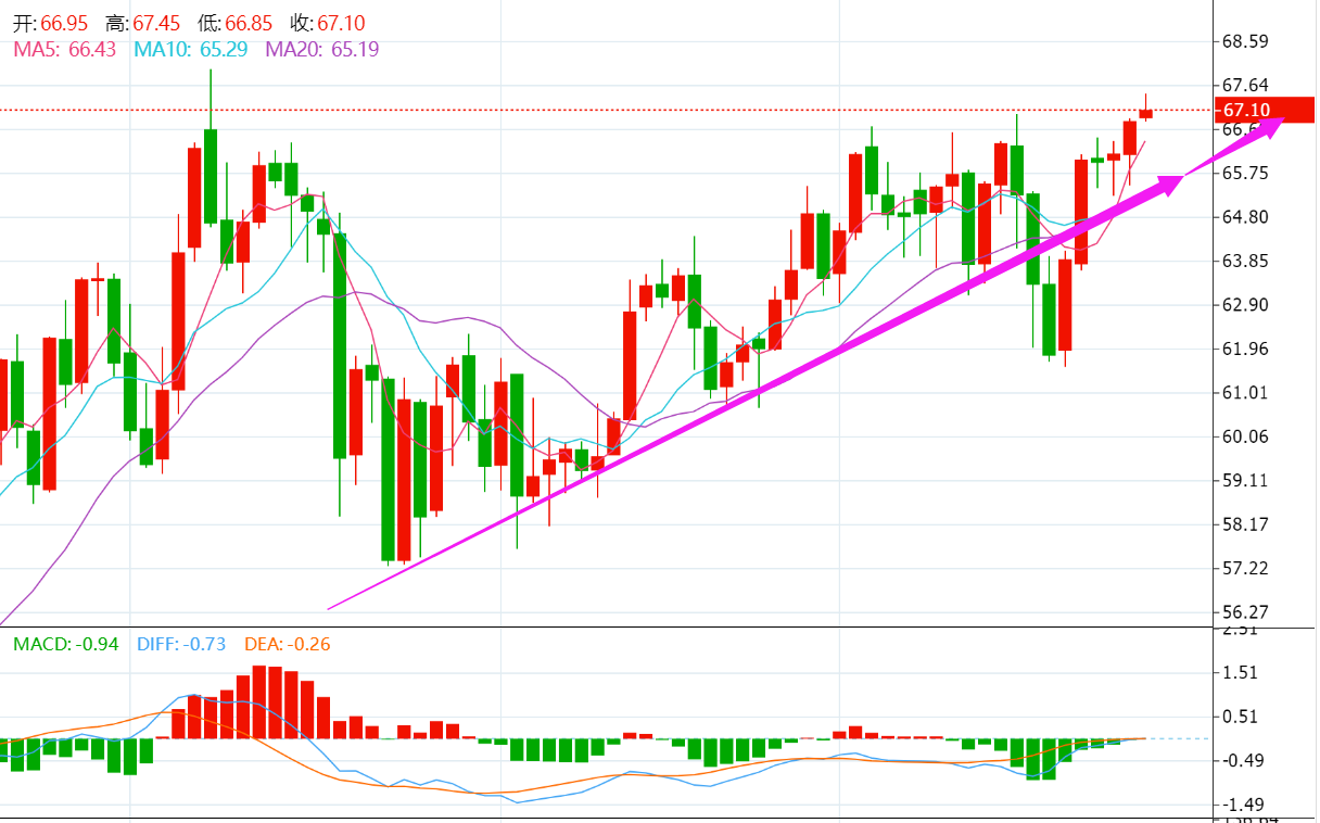 油价触及61.50低点后强势反弹,在连续盘整后突破左侧高点压制开启上行空间,短线面临较大上行压力,行情将有反复,但整体维持上行趋势,建议回调止跌后逢低做多。 稳重者:入场位65.60-66.10,止损位65.10,止盈位67.40。 激进者:入场位65.90-66.40,止损位65.50,止盈位67.70。