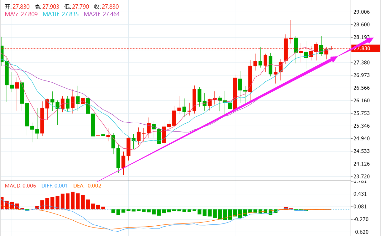 银价触及28.65高点后受阻回落,目前止跌于27.50上方,短线维持高位强势盘整格局,MA均线发散上行构成技术支撑,整体维持上行通道,建议回调止跌后逢低做多。 稳重者:入场位26.90-27.20,止损位26.50,止盈位27.70。 激进者:入场位27.10-27.40,止损位26.70,止盈位28.10。