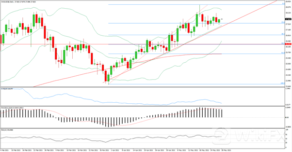 日线级别小幅收涨,日内下探再次受到斐波23.6回撤支撑, MACD上行动能继续减弱,RSI偏向多方,4小时级别受到支撑后重新上涨站上布林带中轨之上,MACD处于多空博弈态势,RSI向上涨回50轴线,今日空单在27.8-27.9区域入场,止损28.35,止盈27.4,破了 看 27.1,26.9