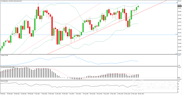 日线级别跟着两颗十字星小幅收涨,价格收至历史高位,向下试探后被压回,仍位于上行趋势线之上,MACD上行动能增强,RSI涨回50轴线还未回测,RSI50轴线,上行趋势线和布林带中轨在下方作为支撑,4小时级别价格震荡结束向上突破,布林带口拉开,MACD上行动能增强,RSI偏向多方临近超买。今日多单在66入场,止损在65.5,止盈66.5,67。