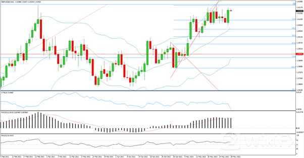 日线级别大幅收涨,涨破斐波23.6%回撤,MACD上行动能重新增强,RSI偏向多方,4小时级别整体仍处于高位盘整震荡,但疑似向上突破收敛三角形形态,RSI涨破50轴线,今日多单在1.415附近入场,止损在1.409,止盈 1.422.