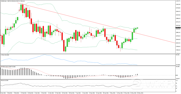 日线级别回踩上行趋势线后小幅收涨指标上看,MACD上行动能持续增强,RSI相对强弱指标偏向多方,4小时级别K线高位窄幅震荡后走出区间大幅拉涨,MACD上行动能得到延续,但RSI在超买区间运行,短线有回调需求,今日多单在29065区域入场,防守28750,止盈参考29400。