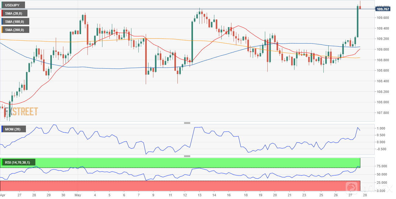 美元/日元货币对在109.70的价格区域内交易,从而纠正了超买情况。从技术角度来看,它有扩展其进步的空间。4小时图显示,技术指标正在从极端读数中修正,但仍处于超买水平。20 SMA转向更高的位置。