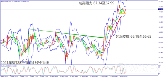 早上美股道琼斯电子盘交易上涨,带动美油冲高至67.32美元。若欧元区公布经济数据大都利好,一旦欧美股市上涨,有机会带动美油价格挑战波段新高。晚间如果美国公布经济数据大都不佳,一旦美股出现下跌走势,可能造成油价出现回调。周六清晨关注美国公布当周石油钻井总数,若公布总数高于市场预期,可能造成油价下跌。