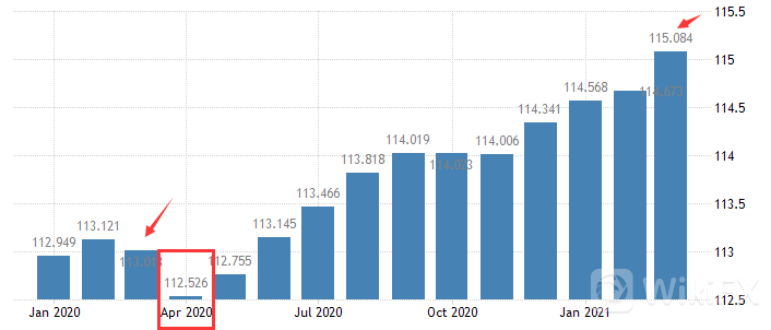 但也正是基数效应和经济重启良好,4月份的PCE个人消费支出势必将创出更大涨幅。上图中能明显看出,去年4月份(红色方框)的个人消费支出指数处于近1年的低位,达112.526。