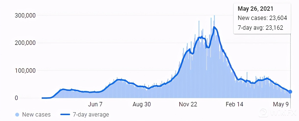疫苗接种推进和对企业的限制正在逐步解除,美国疫情病例也稳步减少。最新数据显示,单日确诊病例已经减少至第一波疫情水平下方,7天平均确诊病例也处显著下跌趋势。