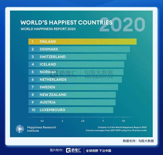 在2020年联合国发布的《世界幸福指数报告》中,芬兰、丹麦、瑞士、冰岛、挪威名列全球最幸福国家前五,并且芬兰已经连续第三年蝉联冠军。