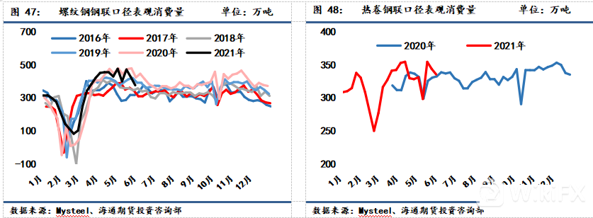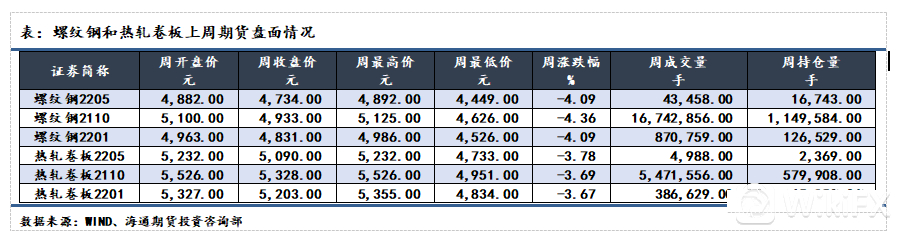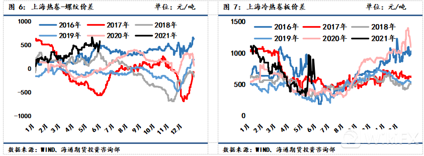 上周成品材期货盘面价格先跌后涨,呈“V”字走势,现货价格同样先跌后涨。上周螺纹钢2110合约下跌4.36%至4933元/吨,热轧卷板2110合约下跌3.69%至5328元/吨。螺卷近远月价差缩小,现货弱于期货,基差走弱;期货方面热卷主力合约略强于螺纹,卷螺主力合约价差小幅走强;铁矿略强于成材,螺矿比小幅回落。