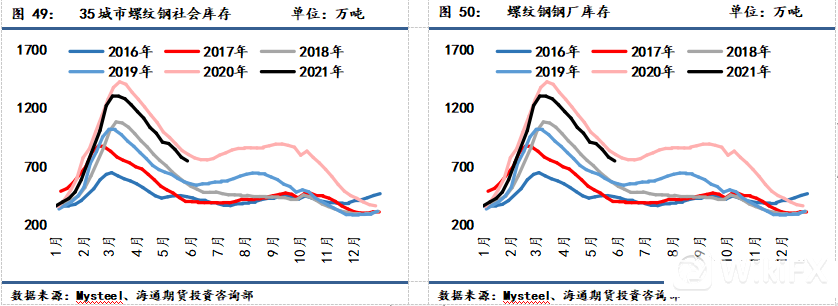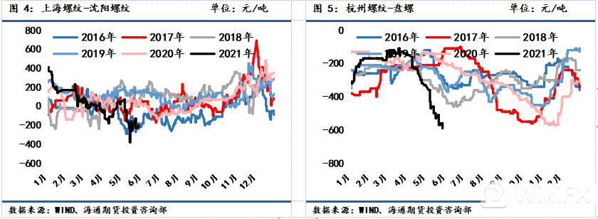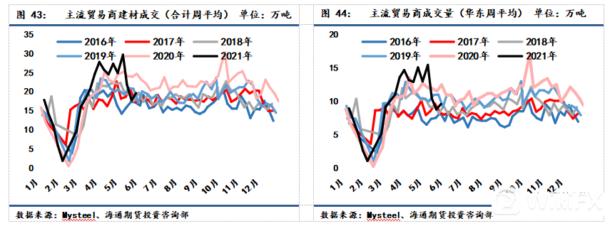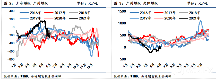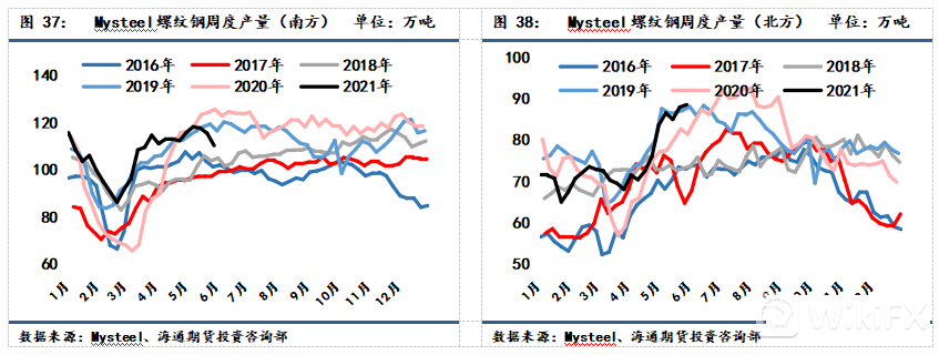 上周成品材期货盘面价格先跌后涨,呈“V”字走势,现货价格同样先跌后涨。上周螺纹钢2110合约下跌4.36%至4933元/吨,热轧卷板2110合约下跌3.69%至5328元/吨。上周上海螺纹下跌290元/吨至4870元/吨,杭州螺纹下跌270元/吨至4840元/吨,广州螺纹下跌330元/吨至5160元/吨附近,北京螺纹下跌340元/吨至5110元/吨。螺纹华东华南过磅价差增至-139元/吨附近,华南北方过磅价差从-5收窄至-67元/吨附近。上海热卷下跌230元/吨至5450元/吨,广州热卷下跌230元/吨至5350元/吨,华东卷螺价差从热卷价格高出螺纹520元/吨扩大至580元/吨。