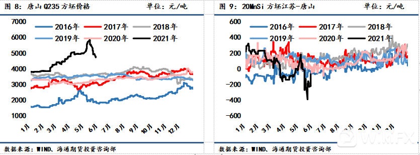 上周各地区钢坯现货价格表现偏弱,唐山方坯Q235下跌370元/吨至4780元/吨,唐山20MnSi下跌370元/吨至4880元/吨,江苏20MnSi下跌250元/吨至4810元/吨,江苏和唐山间价差升至-70元/吨。