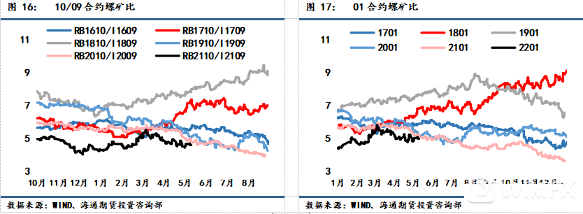螺纹10-01月间价差从129缩小至109元/吨,01-05月间价差从91扩大至97元/吨;热卷10-01月间价差从146缩小至125元/吨,01-05月间价差从97扩大至113。上周热卷盘面价格表现略强于螺纹,原料铁矿石表现略强于成材,10合约卷螺差从381小幅走扩至395元/吨,10/09合约螺矿比价从4.66缩小至4.64。