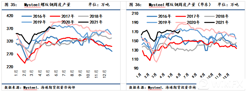 上周螺纹钢产量周环比增加0.42万吨至371.04万吨,同比增速环比前期缩小,同比去年水平减少5.83%,其中长流程产量回升,短流程产量回落。分地区来看,华东地区和北方地区产量均有增加,仅南方地区产回落。