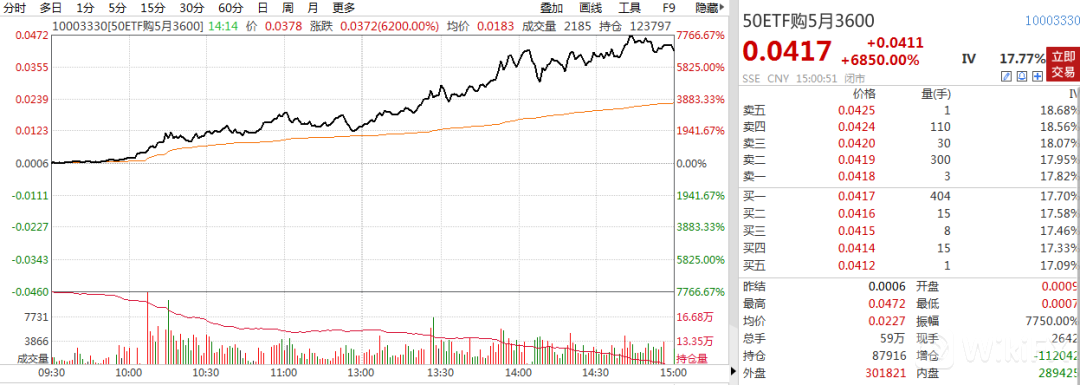 一个合约的涨幅反映的是前后交易日结算价的变化,并不等于实际收益。不同的投资者买卖时点不同,损益情况会差别很大。以50ETF购5月3600为例,如果追涨进场,投资者的收益不一定会很理想。今日该合约成交均价是0.0227,收盘价0.0417,若以均价买入,当日收益为84%,这就意味着,今天入场的投资者实际平均只获得了84%的收益,远低于所谓的68倍收益。