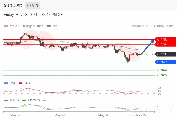 澳元/美元 当日内: 有上涨的可能,目标价位定在 0.7768 。 0.7676 作为转折点。 交易策略:有上涨的可能,目标价位定在 0.7768 。备选策略:如跌破 0.7676 ,AUD/USD 目标方向定在 0.7642 和 0.7622 。 技术点评 :RSI技术指标小于中性区域50。 MACD技术指标呈现看跌状态并 处在其信号线的上方。 另外,价位在其50天移动平均线以下 ( 0.7724 ) 但高于20天移动平均线 ( 0.7705 )。