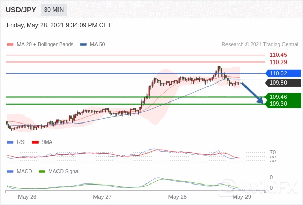 美元/日元 当日内: 看跌,在 110.02 之下。 110.02 作为转折点。 交易策略:看跌,在 110.02 之下。备选策略:向上突破 110.02 ,将带来继续上行的趋势,目标位定在 110.29 和 110.45 。 技术点评 :RSI技术指标小于中性区域50。 MACD技术指标处在其信号线之下 看空。 此外,价位低于其20天及50天移动平均线 ( 分别位于 109.92 和 109.88 )。