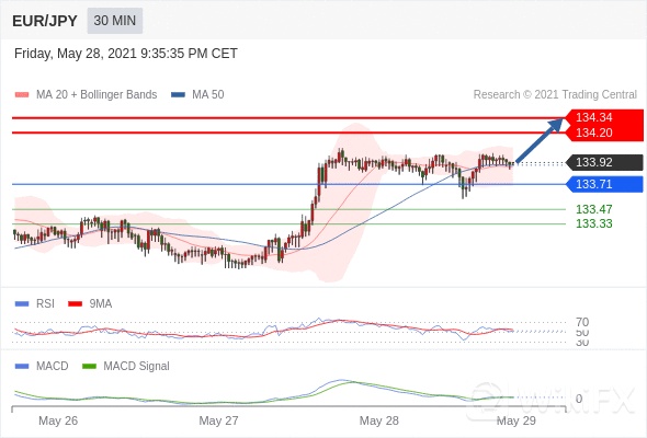 欧元/日元 当日内: 看涨,当 133.71 为支撑位。 133.71 作为转折点。 交易策略:看涨,当 133.71 为支撑位。备选策略:向下跌破 133.71 ,将带来继续下跌的趋势,目标位为 133.47 然后为 133.33 。 技术点评 :RSI技术指标大于中性区域50。 MACD技术指标呈现看多状态并 处在其信号线的上方。 此外,价位高于其20天及50天移动平均线 ( 分别位于 133.88 和 133.89 )。