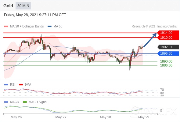 Gold 当日内: 看涨,当 1896.50 为支撑位。转折点为:1896.50 交易策略:看涨,当 1896.50 为支撑位。 备选策略:向下跌破 1896.50 ,将带来继续下跌的趋势,目标位为 1890 然后为 1886.50 。 技术点评 :RSI技术指标大于中性区域50。 MACD技术指标呈现看多状态并 处在其信号线的上方。 此外,价位高于其20个时期及50个时期移动平均线 ( 分别位于 1896.26 和 1895.26 )。