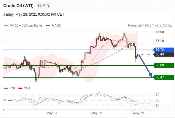 原油 (WTI)(N1)当日内: 没有明显变化趋势。 转折点:66.70 交易策略:在 66.70 之下,看跌,目标价位为 66.00 ,然后为 65.47 。 备选策略:在 66.70 上,看涨,目标价位定在 67.10 ,然后为 67.50。 技术点评:RSI技术指标在50%中性区域之下。
