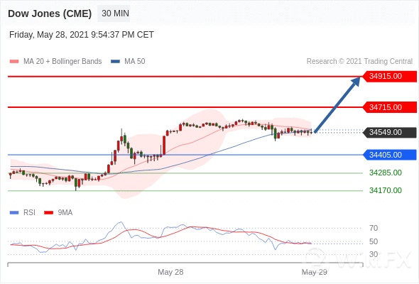美国道琼斯30指数 (M1)当日内: 看涨。转折点:34405.00 交易策略:在 34405.00 之上,看涨,目标价位为 34715.00 ,然后为 34915.00 。 备选策略:在 34405.00 下,看空,目标价位定在 34285.00 ,然后为 34170.00。 技术点评:RSI技术指标在50%中性区域下方,并向上反转。