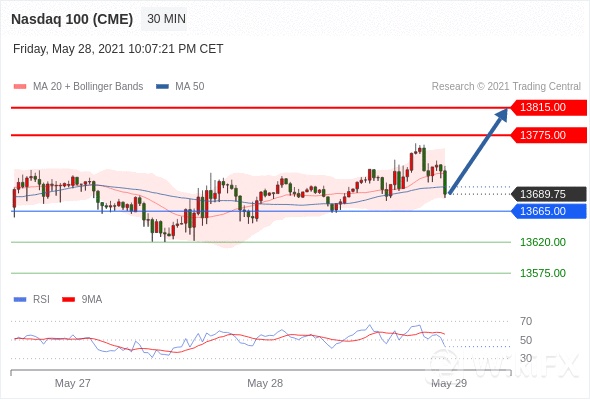 美国纳斯达克100指数期货 (M1)当日内: 上升空间有限。转折点:13665.00 交易策略:在 13665.00 之上,看涨,目标价位为 13775.00 ,然后为 13815.00 。 备选策略:在 13665.00 下,看空,目标价位定在 13620.00 ,然后为 13575.00。 技术点评:RSI技术指标在50%中性区域下方,并向上反转。