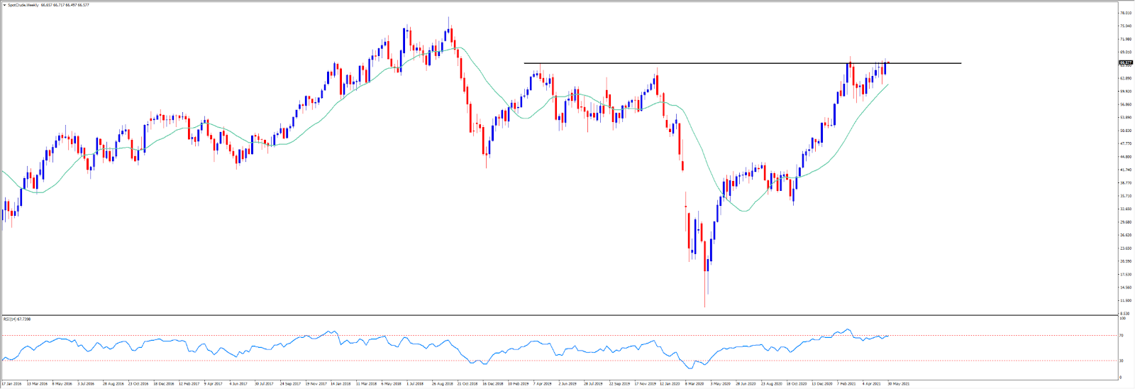 WTI原油(SpotCrude)上周大涨4.26%,收于66.59,油价正在尝试突破3月以来的阻力区域。