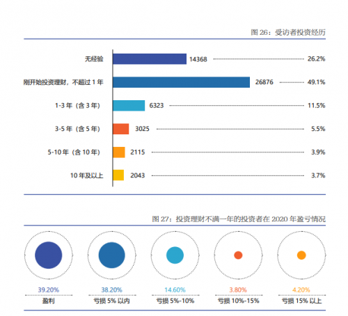 《国民财商教育发展白皮书(2021年)》一项调研数据显示,近八成受访者开展积极的资产管理与投资理财,其中近半受访者刚涉足投资领域;然而投资市场对新进入者并不友好,2020年,60.8%的新入市者蒙受理财亏损。调研数据显示,仅有 26.2%的受访者对投资理财毫无经验,近一半受访者于2020年新进入投资市场,但其中60.8% 的人在2020年交出了“学费”,38.2% 的新散户亏损在 5%以内,亏损在15%以上的有4.2%。