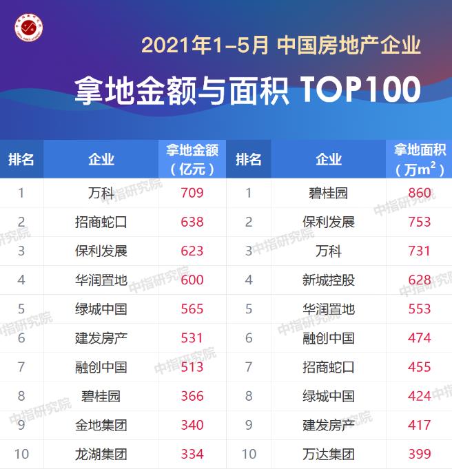 根据榜单,1-5月,TOP100企业拿地总额13274亿元,规模同比增长14.3%。TOP100门槛值为29亿元,与去年同期相比有所下降,TOP100企业招拍挂权益拿地总额占全国300城土地出让金的比例为59.7%,比重有所上升。