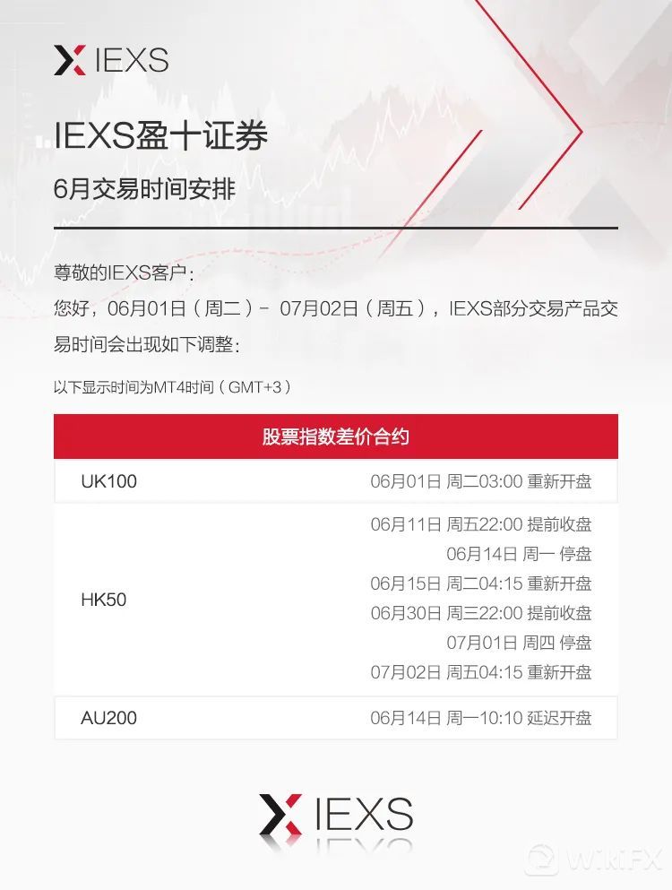 您好,2021年6月3日(周二)-2021年7月2日(周五),IEXS部分交易产品交易时间将出现相应调整如下: