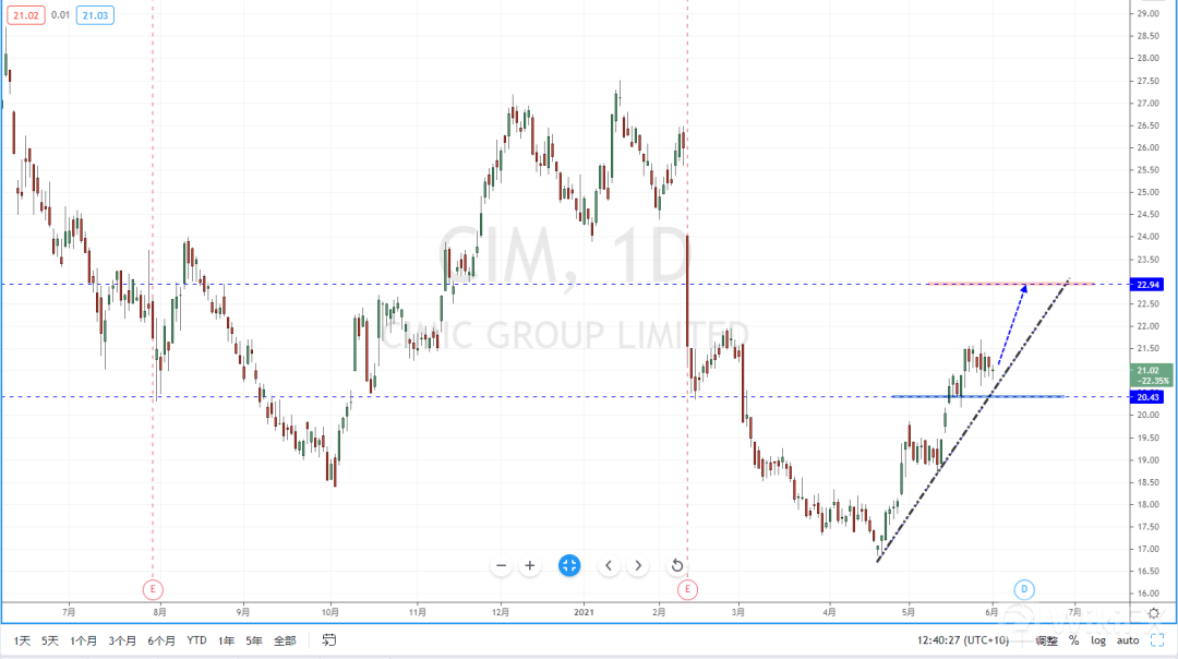 CIM:近期整体股票市场趋于清淡,因此市场动能尚缺。但在下半周需要相关的数据公布对市场的影响。从CIM目前整体趋势处于在多头阶段中,下方有上升趋势线的支撑作用,短期水平支撑带在20.43附近。可适当关注价格在此多重支撑点附近测试后起稳上行机会,上方区间目标位置参考22.94一带。