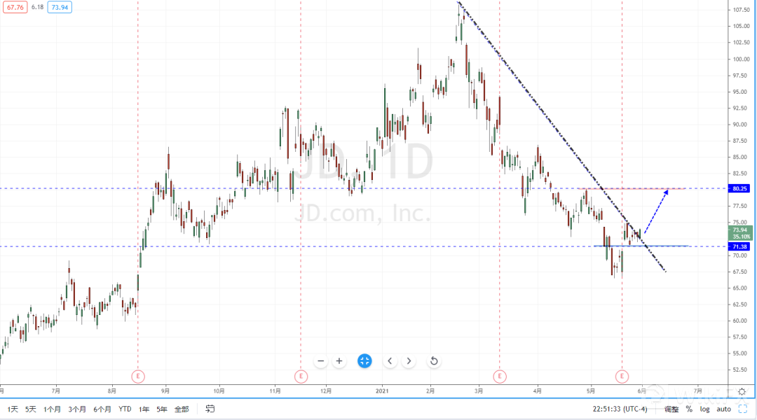 JD:虽然近期市场处于休市阶段,但从近期市场的表现趋于偏多。从JD整体趋势,在持续下行之后有止跌起稳迹象。并且价格有突破下降趋势线的压制作用,短期水平支撑带在71.38附近。处于相对底部阶段,可适当关注价格调整后继续上行的多头机会,上方目标位置采参考80.25一带。