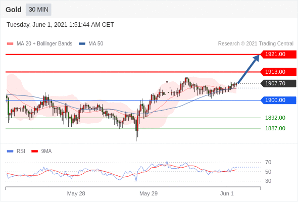 交易策略:在1900.00之上,看涨,目标价位为1913.00,然后为1921.00。