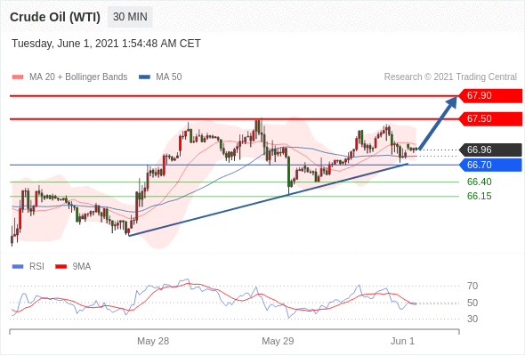 交易策略:在66.70之上,看涨,目标价位为67.50,然后为67.90。