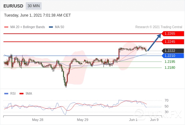 欧元/美元 当日内: 上升趋势。 转折点:1.2210 交易策略:在 1.2210 之上,看涨,目标价位为 1.2245 ,然后为 1.2265 。备选策略:在 1.2210 下,看空,目标价位定在 1.2195 ,然后为 1.2180。 技术点评:RSI技术指标缺乏下降动能 。
