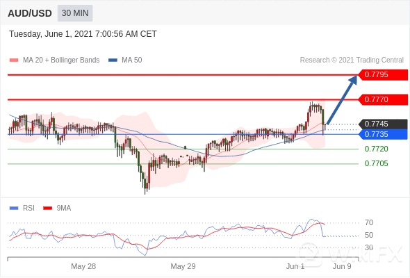 澳元/美元 当日内: 谨慎操作。 转折点:0.7735 交易策略:在 0.7735 之上,看涨,目标价位为 0.7770 ,然后为 0.7795 。备选策略:在 0.7735 下,看空,目标价位定在 0.7720 ,然后为 0.7705。 技术点评:RSI技术指标运行趋势复杂,应谨慎操作。
