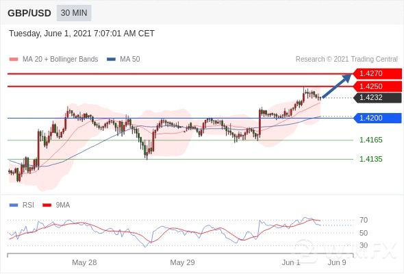 英镑/美元 当日内: 看涨。 转折点:1.4200 交易策略:在 1.4200 之上,看涨,目标价位为 1.4250 ,然后为 1.4270 。备选策略:在 1.4200 下,看空,目标价位定在 1.4165 ,然后为 1.4135。 技术点评:RSI技术指标向上运行。