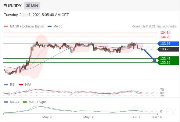 欧元/日元 当日内: 看跌,在 133.97 之下。 133.97 作为转折点。 交易策略:看跌,在 133.97 之下。备选策略:向上突破 133.97 ,将带来继续上行的趋势,目标位定在 134.20 和 134.34 。 技术点评 :RSI技术指标低于50。 MACD技术指标呈现看跌状态并 处在其信号线的下方。 此外,价位低于其20天及50天移动平均线 ( 分别位于 133.88 和 133.82 )。