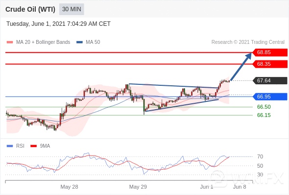 原油 (WTI)(N1)当日内: 新一轮上升。转折点:66.95 交易策略:在 66.95 之上,看涨,目标价位为 68.35 ,然后为 68.85 。 备选策略:在 66.95 下,看空,目标价位定在 66.50 ,然后为 66.15。 技术点评:RSI技术指标看涨,有进一步上升空间。